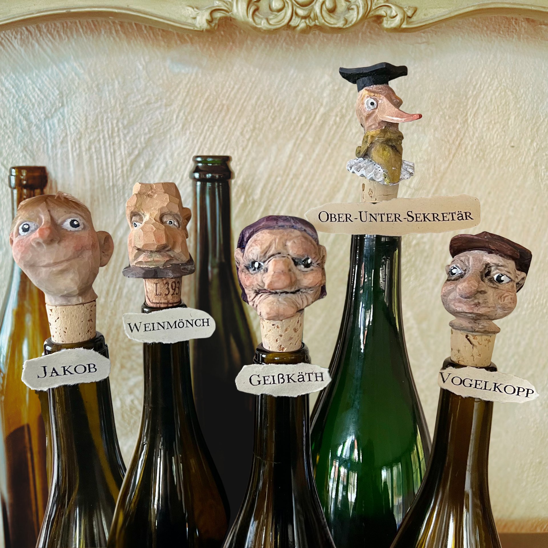 Korkenkopf Unsere Korkenköpfe sind kleine Unikate aus dem Theater der Nacht. Jeder einzelne wird in liebevoller Handarbeit gegossen, anschließend sorgfältig von Hand bemalt und trägt den Charakter einer unserer bekannten Figuren aus den Theaterstücken. Die Korkenköpfe dienen als dekorativer Flaschenverschluss für Wein- oder andere Glasflaschen und können nach dem Öffnen ganz einfach als Stopfen verwendet werden. Da jeder Kopf einzeln gefertigt wird, gleicht keiner dem anderen – jedes Stück ist ein kleines Kunstwerk mit eigenem Ausdruck. 33,00 € Varianten zeigen Geißkäth Aus Der Hexenjäger. Die schlaue, bissige Geißkäth als handbemalter Korkenkopf. 33,00 € inkl. 19% MwSt. Menge - + Weinmönch Aus Der Teufel mit den drei goldenen Haaren. Ein fröhlicher Mönch mit großer Liebe zum Wein – ideal als charmantes Flaschenköpfchen. 33,00 € inkl. 19% MwSt. Menge - + Vogelkopp Aus Der Vogelkopp. Der kräftige Holzfäller als Mini-Kopf für den Flaschenverschluss. 33,00 € inkl. 19% MwSt. Menge - + Ober-Unter-Sekretär Aus Der Vogelkopp. Der eifrige Untersekretär als handbemalter Korkenkopf. 33,00 € inkl. 19% MwSt. Menge - + Jakob Aus Zwerg Nase. Der verwunschene Junge, später Meisterkoch – als kleiner handbemalter Kopf. 33,00 € inkl. 19% MwSt. Menge - +
